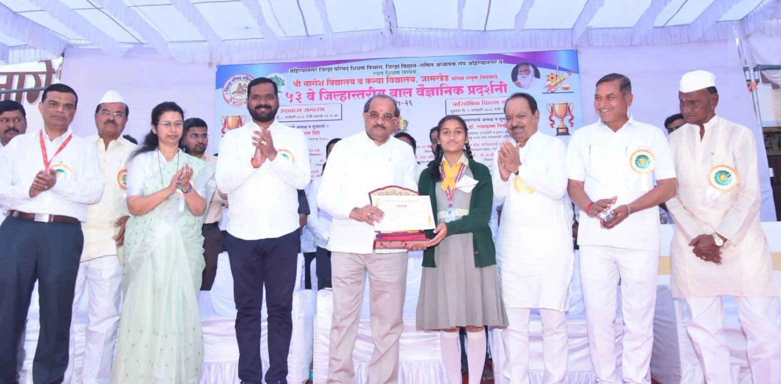 जामखेड येथील नागेश विद्यालय येथे जिल्हा परिषदेच्या शिक्षण विभाग व जिल्हा विज्ञान-गणित अध्यापक संघ, अहिल्यानगर यांच्या संयुक्त विद्यमाने आयोजित ५३ वे जिल्हास्तरीय बाल वैज्ञानिक प्रदर्शन २०२५-२६ चा पारितोषिक वितरण समारंभ मंत्री विखे पाटील यांच्या उपस्थितीत संपन्न झाला. कार्यक्रमास जिल्हा बँकेचे संचालक अंबादास पिसाळ, नितीन दिनकर, मनोज कुलकर्णी, विनायक देशमुख, शिक्षणाधिकारी (माध्यमिक) संध्या गायकवाड, शिक्षणाधिकारी (प्राथमिक) भास्कर पाटील, उपशिक्षणाधिकारी आकाश दरेकर, गटविकास अधिकारी प्रदीप चव्हाण, नागेश विद्यालयाचे प्राचार्य भगवान मडके यांच्यासह अन्य मान्यवर उपस्थित होते.