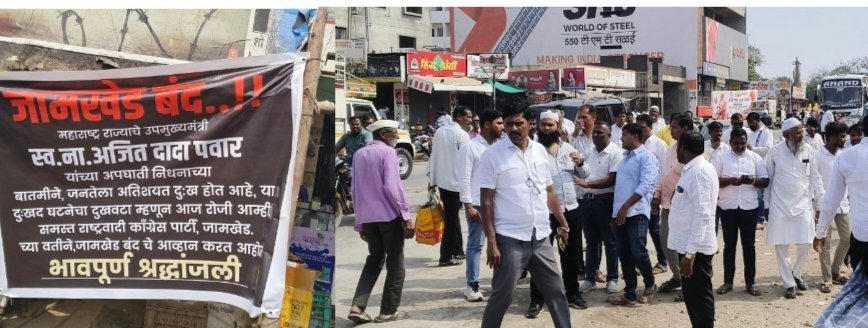 महाराष्ट्राच्या राजकारणातील एक धडाडीचे नेतृत्व आणि राज्याचे उपमुख्यमंत्री अजित पवार यांचे विमान अपघातात दुर्दैवी निधन झाले आहे. या धक्कादायक बातमीमुळे जामखेड तालुक्यातील राष्ट्रवादी काँग्रेसच्या कार्यकर्त्यांनी स्वतः शहरातील रस्त्यावर उतरुन जामखेड शहर बंद ठेवण्याचे आवाहन केले होते. या बंदला व्यापार्यांनी व नागरिकांनी प्रतिसाद दिला. सकाळपासून जामखेड शहर कडकडीत बंद ठेवण्यात आले होते.