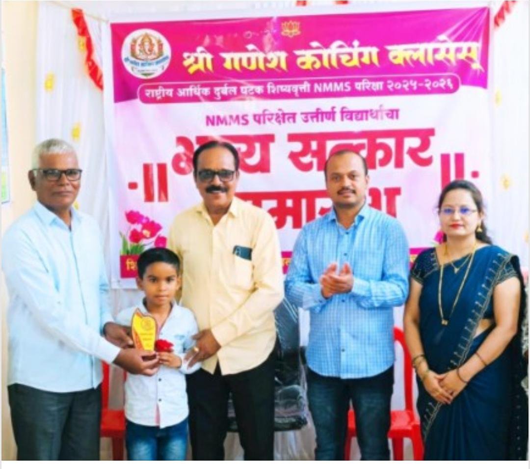 जामखेड प्रतिनिधी: जामखेड येथे श्री गणेश कोचिंग क्लासेसतर्फे आयोजित एन.एम.एम.एस /मंथन राज्यस्तरीय परीक्षेत यश संपादन केलेल्या विद्यार्थ्यांच्या भव्य सत्कार समारंभाचा कार्यक्रम उत्साहपूर्ण वातावरणात पार पडला. रविवारी (दि. ५ एप्रिल २०२६) सकाळी १० वाजता समर्थ हॉस्पिटल मागे, दत्तनगर, बीड रोड येथे हा सोहळा मोठ्या दिमाखात आयोजित करण्यात आला होता. कार्यक्रमाच्या अध्यक्षस्थानी माजी प्राचार्य अनंता खेत्रे होते तर प्रमुख पाहुणे म्हणून माजी प्राचार्य रमेश अडसूळ आदी मान्यवर, पालक व विद्यार्थी उपस्थित होते.