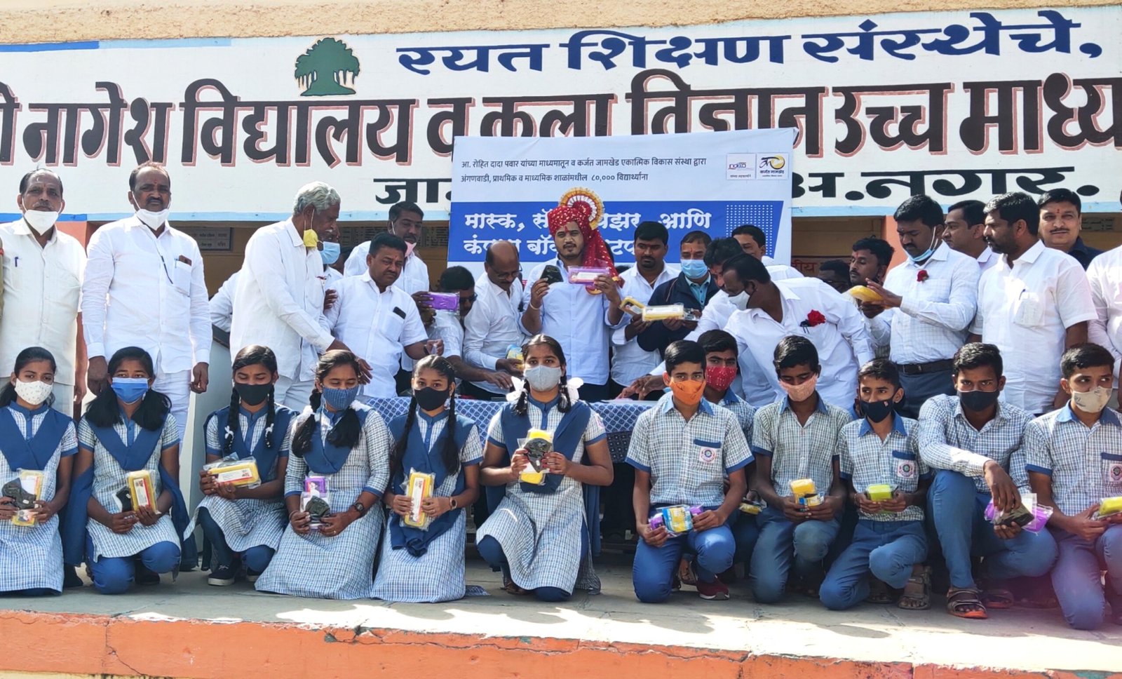 पुढे बोलताना आ. रोहित पवार म्हणाले की अनेक नामांकित कंपन्या सामाजिक काम करत आहेत. या कंपन्यांच्या माध्यमातून विद्यार्थ्यांना मदत केली जात आहे. कर्जत जामखेड मधिल विद्यार्थींनी देखील मला शाळेतील अनेक असुविधा बाबत अडचणी सांगितल्या होत्या. या अडचणी सोडवण्यासाठी तुमचा भाऊ म्हणून मी कटिबद्ध आहे. रयत संस्थेच्या माध्यमातून कर्जत व जामखेड येथील स्वच्छतागृह व पिण्याच्या फील्टर पाण्यासाठी या वर्षात तीन कोटी रुपये खर्च करण्यात येणार आहेत. जगातील एका शाळेला बोलने झाले असुन प्रत्येक शाळेत लवकरच डीजीटल लॉब तयार करण्यात येणार आहे. शिक्षकांच्या ट्रेनिंग साठी जिल्हा नियोजन नीधीच्या माध्यमातून २ कोटी रुपये खर्च करण्यात येणार आहे. या नंतर नागेश विद्यालय व कन्या विद्यालयातील विद्यार्थींनी आ. रोहित पवार यांच्या माध्यमातून व कर्जत-जामखेड एकात्मिक विकास संस्थेद्वारे मास्क, सिनेटायझर व कंपास बॉक्स वाटप करण्यात आले. या नंतर शाळेतील स्वच्छतागृह, पेयजल व हात धुण्याचे स्थानक सुविधांचा भुमीपुजन व विद्यालयातील बॉटनिकल गार्डन उद्घाटन समारंभ आ. रोहित पवार यांच्या हस्ते संपन्न झाला.