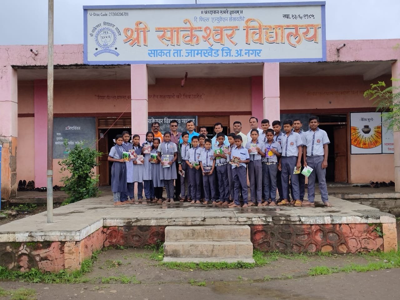 श्री साकेश्वर विद्यालयातील विद्यार्थ्यांना शालेय साहित्य पेन, वही व खाऊचे वाटप करण्यात आले यावेळी अर्जुन रासकर, महादेव मत्रे, अशोक घोलप, त्रिंबक लोळगे, विजयकुमार हराळे, आण्णा विटकर यांच्या सह शिक्षक व शिक्षकेतर तसेच विद्यार्थी मोठ्या संख्येने उपस्थित होते.